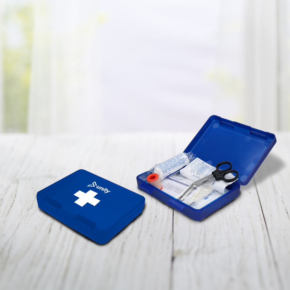 Always be prepared for emergencies, this large kit is filled with all basic first aid necessities. The box is made of plastic and has a snap closure. It contains plasters, gauzes, tape, bandages, compressors, small scissors and disposable gloves. The material is 100% BPA-free. Get the box printed with your logo now!