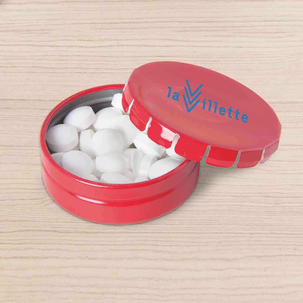 Print your logo or design in full colour on Helloprint API's eye-catching Mints tin click clack! With approx. 12 g mints in one tin, you can enjoy minty freshness while advertising your brand. Great for promotional events or as goodie bag fillers, your clients will thank you. The tin is a handy size that comfortably fits in your pocket. It opens by applying pressure to the top of the tin, and it can be closed again by pressing the sides!