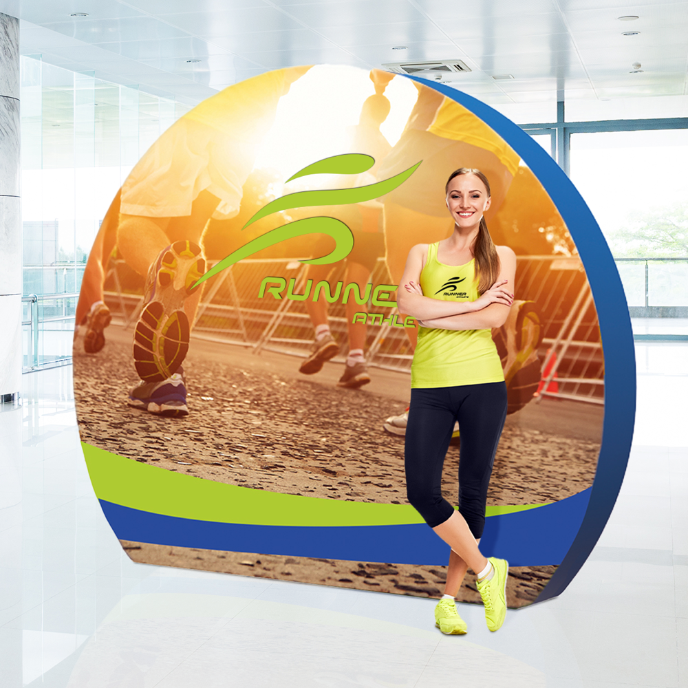 This stand has an original shape and is often used as a separation within a fair. This stand has a typical size to put a table against. By using this stand you can create some privacy if you want to discuss a business proposition. The graphic is washable at 30°c, which makes it perfect for multiple uses. The frame comes with a highly portable carry bag. The fabric of the stand is 260gsm 100% Stretch polyester.