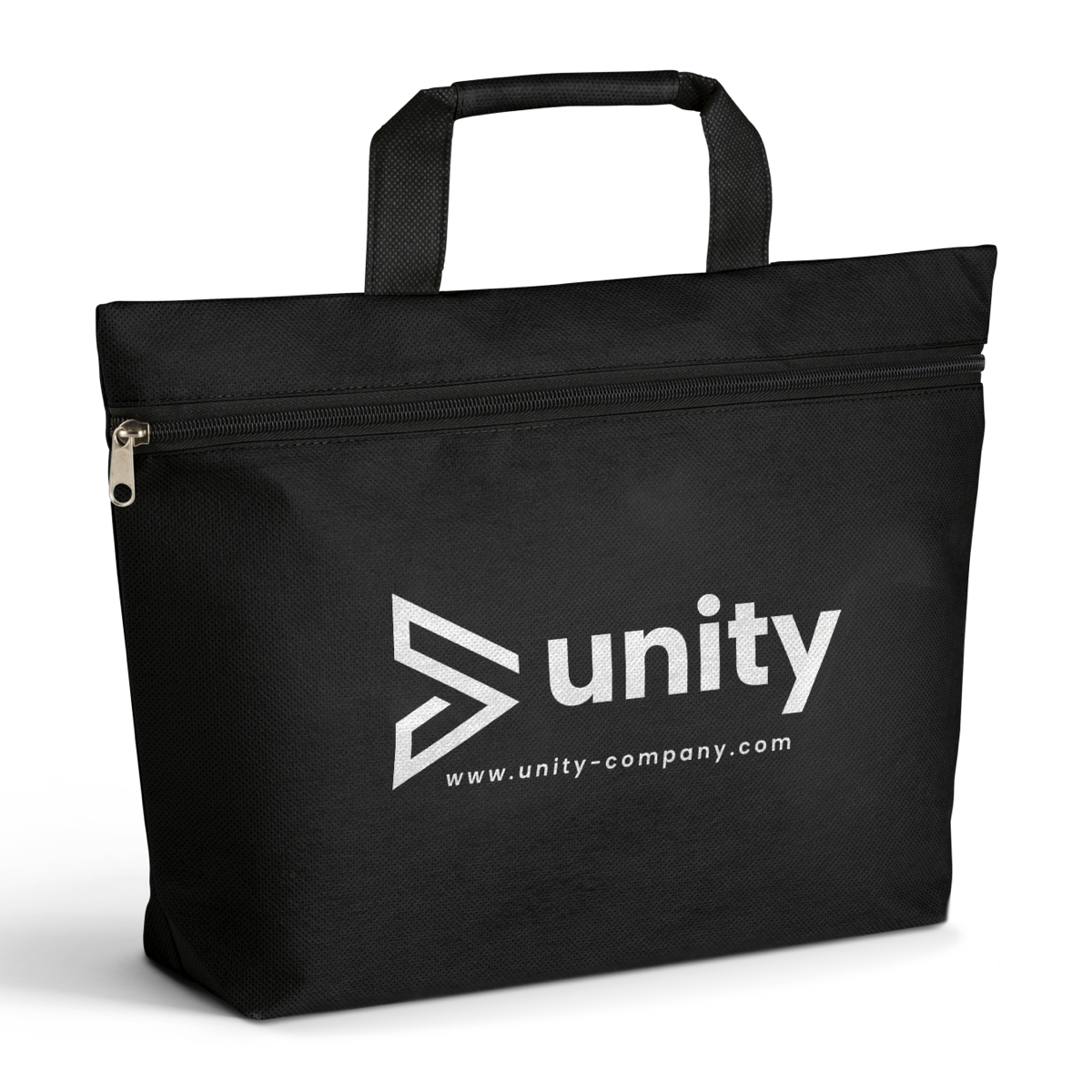 Practical non-woven document bag. With zip, reinforced handle with colour accent and widened base. With it's super strong and lightweight material it is easy to carry around. Available in 2 colours. The size of the bag is 39x9x25,6 cm.