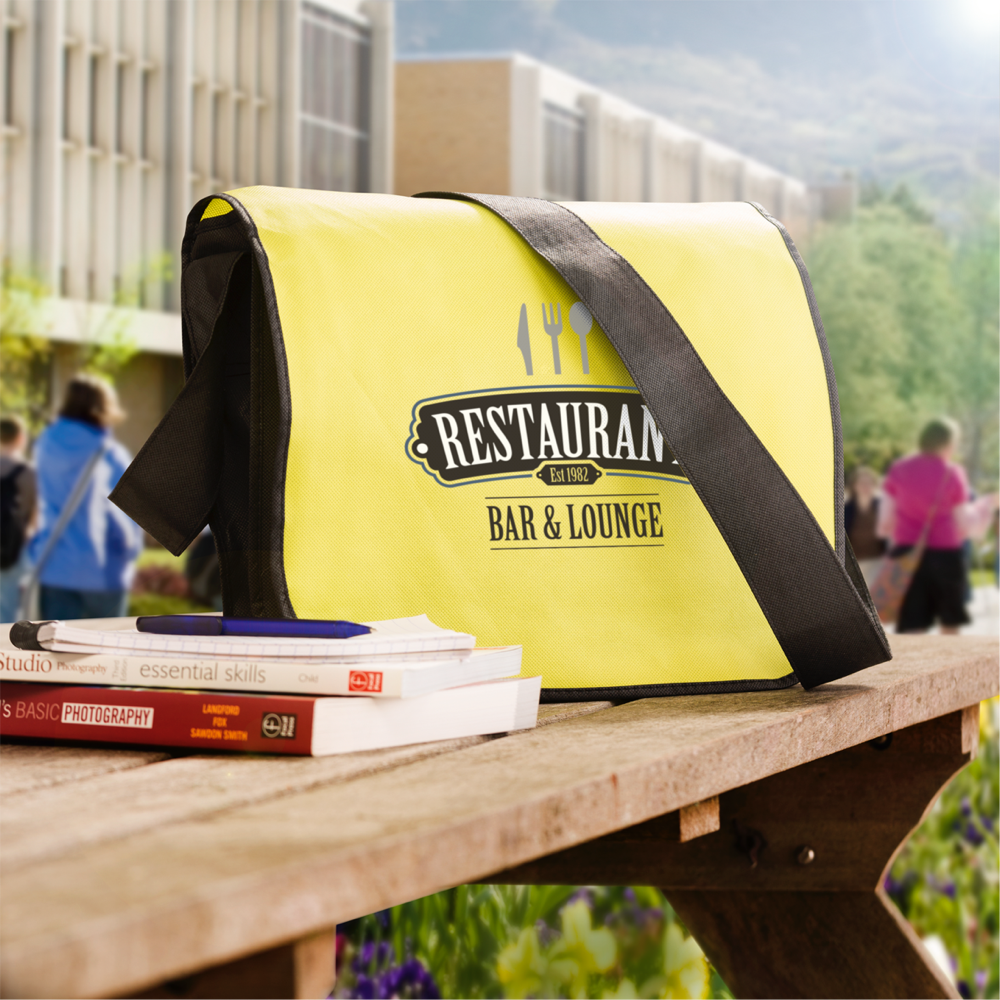The perfect bag to carry around your documents, notebooks and every other thing you would need to be prepared for any meeting or office day. Practical non-woven shoulder bag in a convenient format. Super-light and strong. With a large main compartment, compartments for pens and a shoulder strap with velcro flap. The size of this bag is 36x6x27 cm.